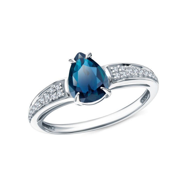Кольцо с 8 бриллиантами природными, 0.037 карат, огранка круг 17 граней, цвет 2, чистота 2, тип огранки А; 14 бриллиантами природными, 0.028 карат, огранка круг 17 граней, цвет 2, чистота 2, тип огранки А; 1 топазом лондон природным, 0.771 карат, тип огранки Б; Белое золото 585 пробы.