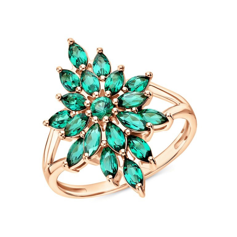 Кольцо с 1 гидротермальным изумрудом, 0.075 карат, тип огранки В; 18 гидротермальными изумрудами, 1.152 карат, тип огранки Б; Розовое золото 585 пробы.