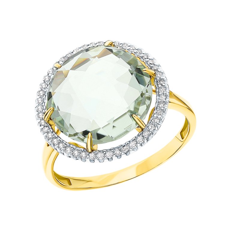 Кольцо с 46 бриллиантами природными, 0.14 карат, огранка круг 17 граней, цвет 2, чистота 2, тип огранки Б; 1 празиолитом природным, 8.639 карат, тип огранки Б; Желтое золото 585 пробы.