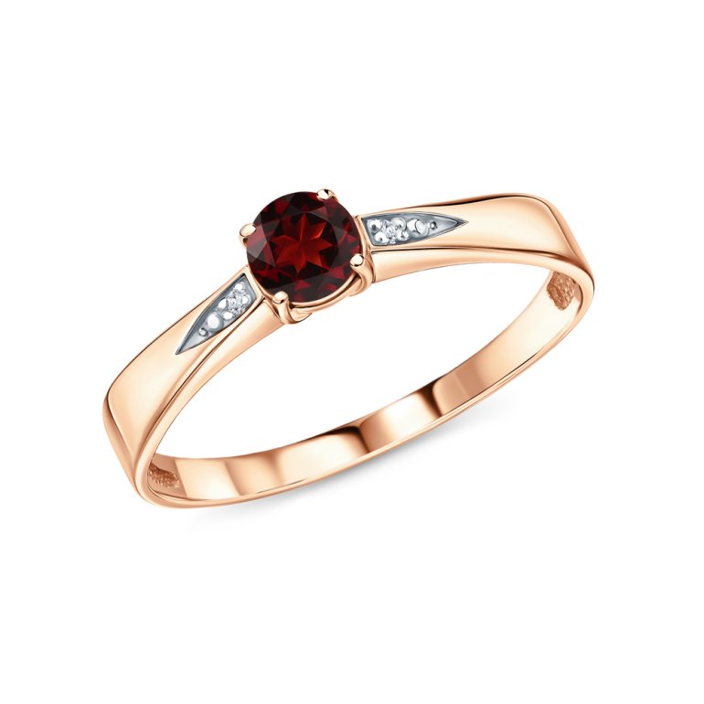 Кольцо с 1 гранатом природным, 0.325 карат, тип огранки В; 2 бриллиантами, 0.009 карат, огранка круг 17 граней, цвет 2, чистота 2, тип огранки А; Розовое золото 585 пробы.