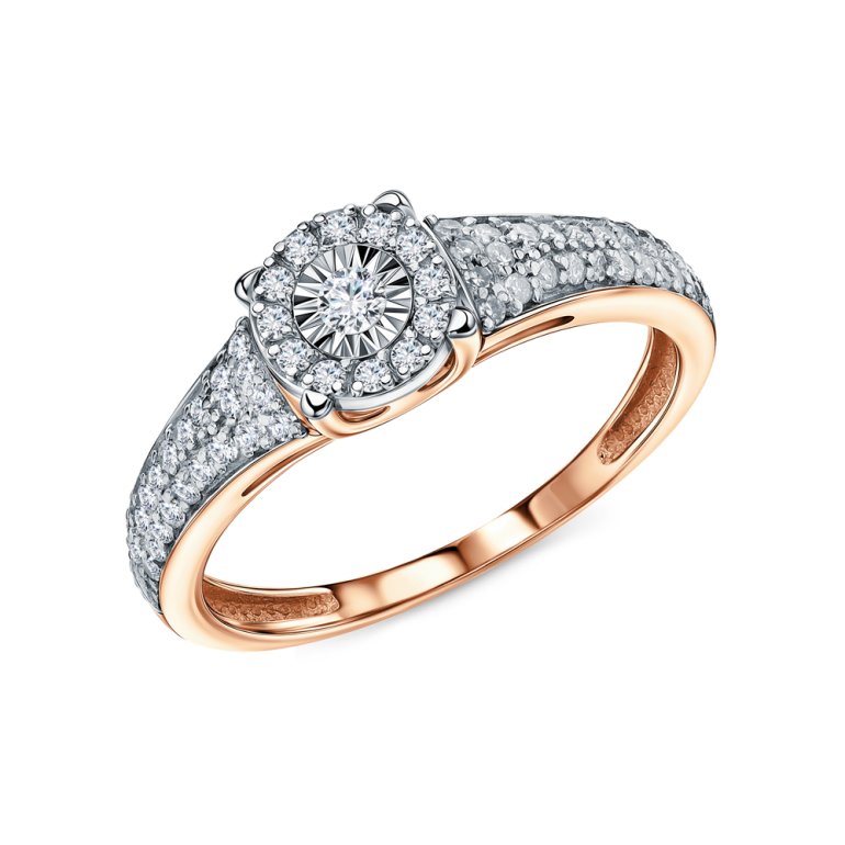 Кольцо с 1 бриллиантом природным, 0.032 карат, огранка круг 57 граней, цвет 4, чистота 5, тип огранки А; 12 бриллиантами природными, 0.059 карат, огранка круг 17 граней, цвет 2, чистота 2, тип огранки Б; 46 бриллиантами природными, 0.152 карат, огранка круг 17 граней, цвет 2, чистота 2, тип огранки Б; Розовое и белое золото 585 пробы.