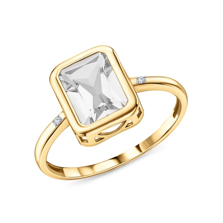 Кольцо с 1 горным хрусталем природным, 1.329 карат, тип огранки Б; 2 бриллиантами, 0.008 карат, огранка круг 17 граней, цвет 2, чистота 2, тип огранки А; Желтое золото 585 пробы.
