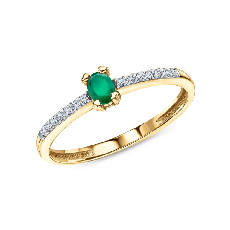 Кольцо с 1 изумрудом природным, 0.146 карат, цвет 3, чистота 3, тип огранки Б; 14 бриллиантами, 0.044 карат, огранка круг 17 граней, цвет 2, чистота 2, тип огранки А; Желтое золото 585 пробы.