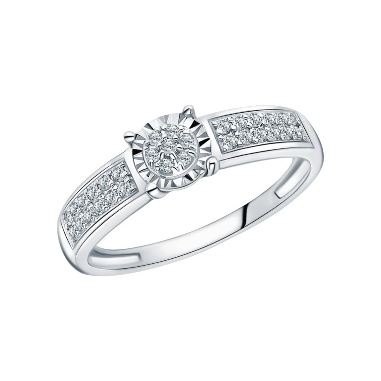 Кольцо с 1 бриллиантом природным, 0.007 карат, огранка круг 57 граней, цвет 4, чистота 5, тип огранки А; 30 бриллиантами природными, 0.135 карат, огранка круг 17 граней, цвет 2, чистота 2, тип огранки А; Белое золото 585 пробы.