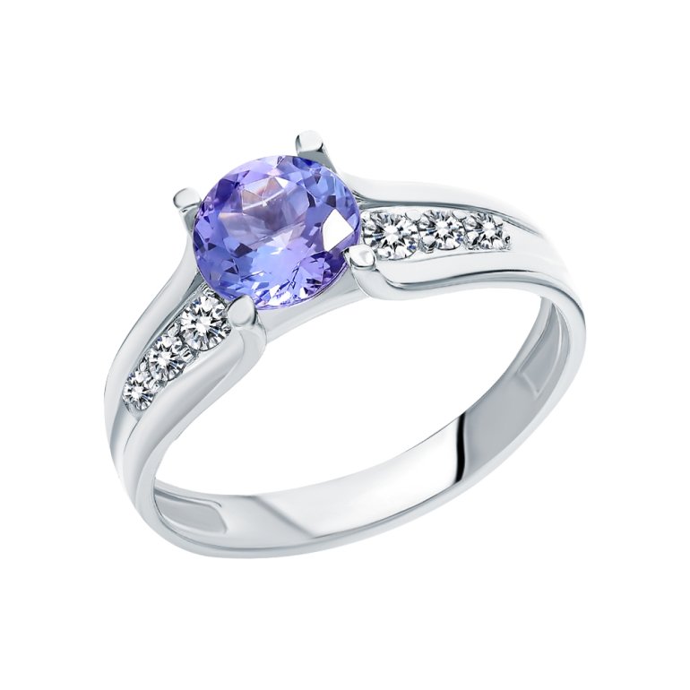 Кольцо с 2 бриллиантами природными, 0.06 карат, огранка круг 57 граней, цвет 4, чистота 5, тип огранки А; 2 бриллиантами природными, 0.046 карат, огранка круг 57 граней, цвет 4, чистота 5, тип огранки А; 2 бриллиантами природными, 0.034 карат, огранка круг 57 граней, цвет 4, чистота 5, тип огранки А; 1 танзанитом природным, 0.806 карат, тип огранки В; Белое золото 585 пробы.