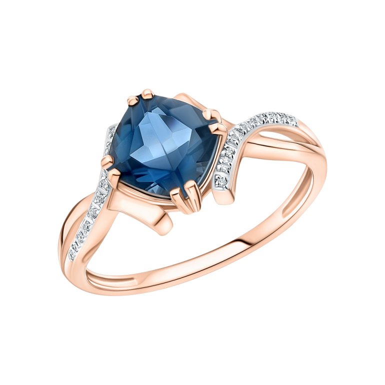 Кольцо с 20 бриллиантами природными, 0.036 карат, огранка круг 17 граней, цвет 2, чистота 2, тип огранки Б; 1 топазом лондон природным, 1.804 карат, тип огранки Б; Розовое золото 585 пробы.