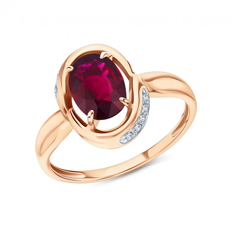 Кольцо с 10 бриллиантами природными, 0.045 карат, огранка круг 17 граней, цвет 2, чистота 2, тип огранки А; 1 рубином синтетическим, 1.35 карат, тип огранки Б; Розовое золото 585 пробы.