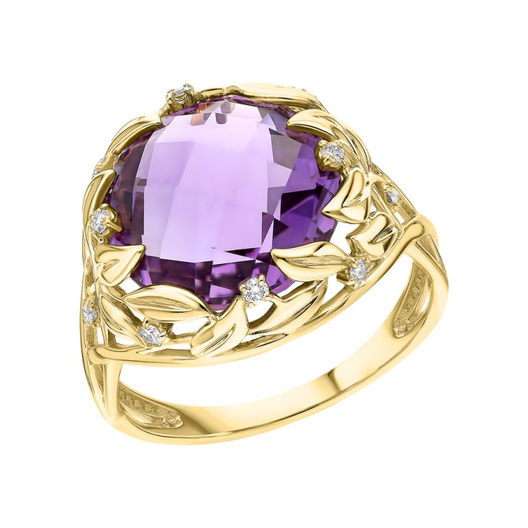 Кольцо с 1 аметистом, 9.395 карат, тип огранки Б; 10 бриллиантами, 0.129 карат, огранка круг 57 граней, цвет 3, чистота 6, тип огранки А; Желтое золото 585 пробы.