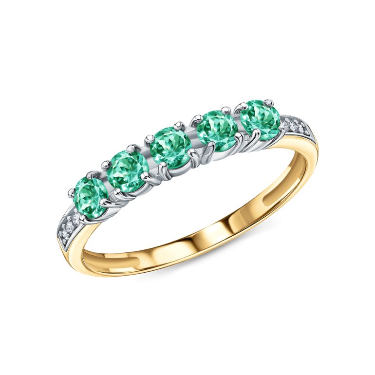 Кольцо с 6 бриллиантами природными, 0.026 карат, огранка круг 17 граней, цвет 2, чистота 2, тип огранки А; 5 изумрудами природными, 0.488 карат, цвет 3, чистота 3, тип огранки В; Желтое золото 585 пробы.
