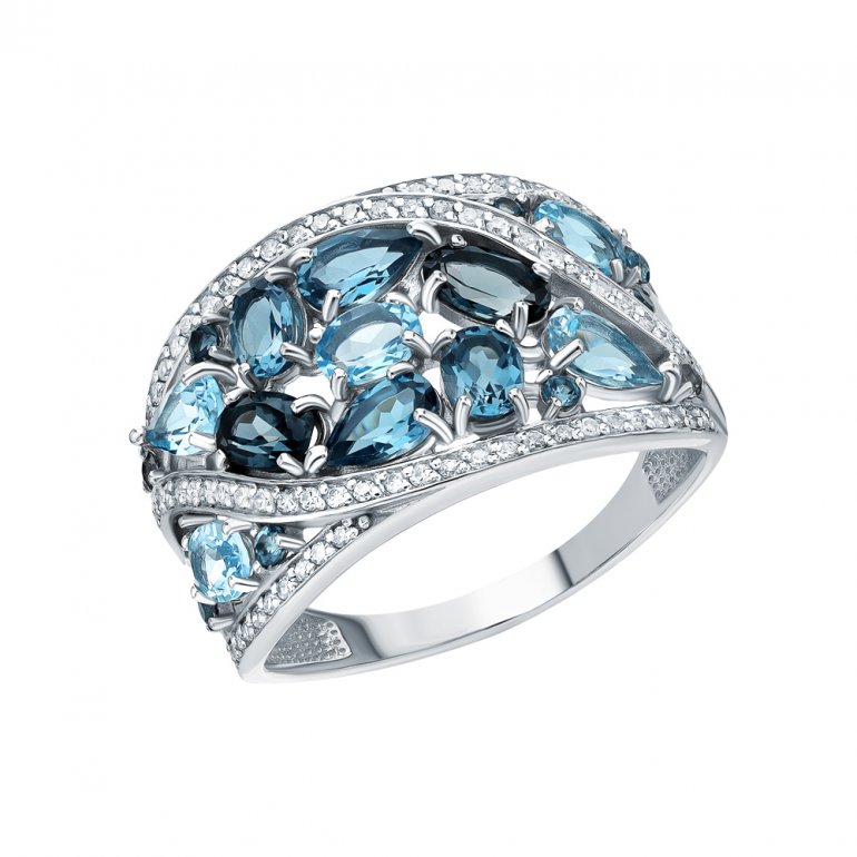 Кольцо с 2 топазами лондон, 0.518 карат, тип огранки Б; 2 топазами свисс, 0.491 карат, тип огранки Б; 2 топазами лондон, 0.446 карат, тип огранки Б; 3 топазами свисс, 0.612 карат, тип огранки Б; 2 топазами лондон, 0.394 карат, тип огранки Б; 10 топазами лондон, 0.19 карат, тип огранки В; 72 бриллиантами, 0.224 карат, огранка круг 17 граней, цвет 2, чистота 2, тип огранки А; Белое золото 585 пробы.