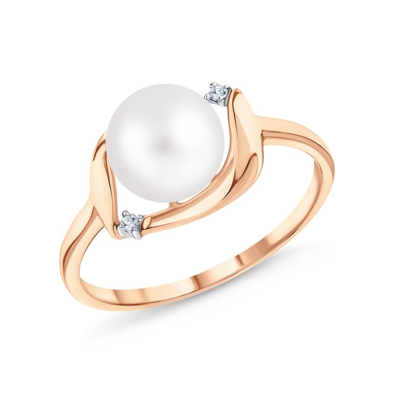 Кольцо с 2 бриллиантами природными, 0.018 карат, огранка круг 17 граней, цвет 2, чистота 2, тип огранки А; 1 жемчугом пресноводным культивированным белым; Розовое золото 585 пробы.