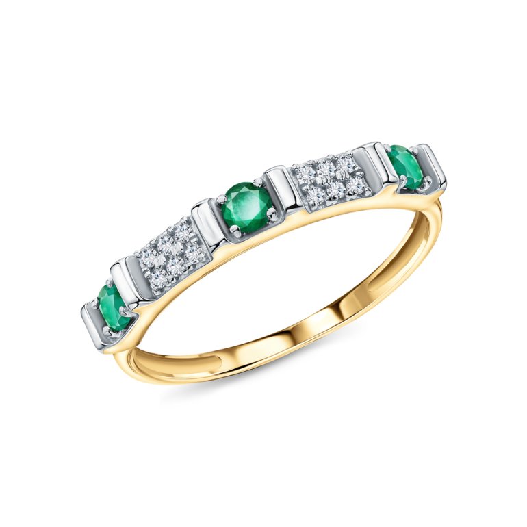 Кольцо с 12 бриллиантами природными, 0.053 карат, огранка круг 17 граней, цвет 2, чистота 2, тип огранки А; 3 изумрудами природными, 0.141 карат, цвет 3, чистота 3, тип огранки В; Желтое золото 585 пробы.