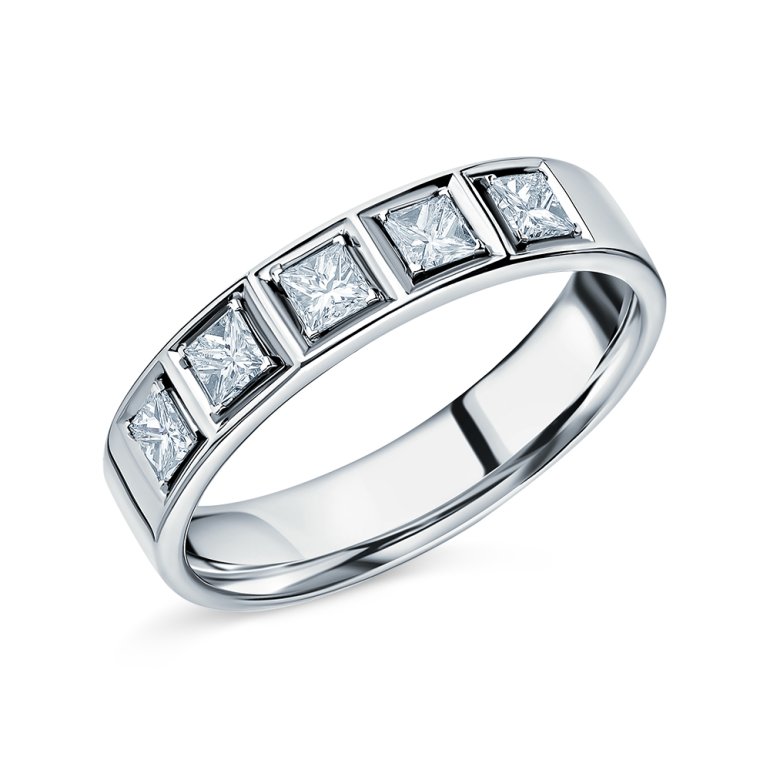 Кольцо с 5 бриллиантами природными, 0.434 карат, огранка принцесса 65 граней, цвет 3, чистота 6, тип огранки А; Белое золото 585 пробы.
