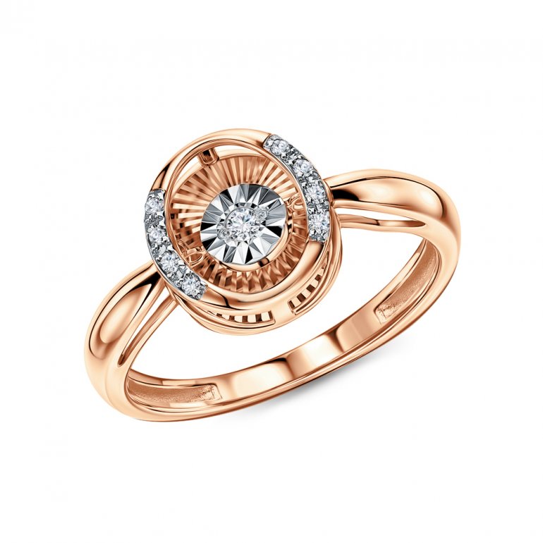Кольцо с 1 бриллиантом природным, 0.014 карат, огранка круг 57 граней, цвет 3, чистота 6, тип огранки А; 8 бриллиантами природными, 0.031 карат, огранка круг 17 граней, цвет 2, чистота 2, тип огранки А; Розовое золото 585 пробы.