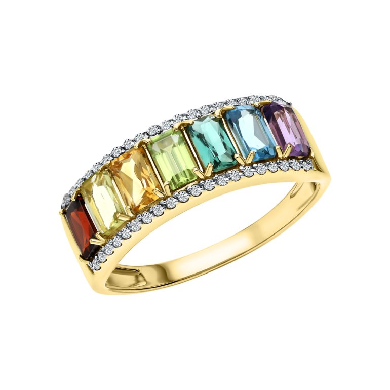 Кольцо с 1 гранатом природным, 0.36 карат, тип огранки Б; 1 топазом свисс природным, 0.345 карат, тип огранки Б; 1 хризолитом природным, 0.273 карат, тип огранки Б; 1 аметистом природным, 0.271 карат, тип огранки Б; 1 кварцем лимонным природным, 0.268 карат, тип огранки Б; 1 цитрином природным, 0.233 карат, тип огранки Б; 1 синтетическим зеленым кварцем, 0.214 карат, тип огранки Б; 40 бриллиантами, 0.119 карат, огранка круг 17 граней, цвет 2, чистота 2, тип огранки А; Желтое золото 585 пробы.