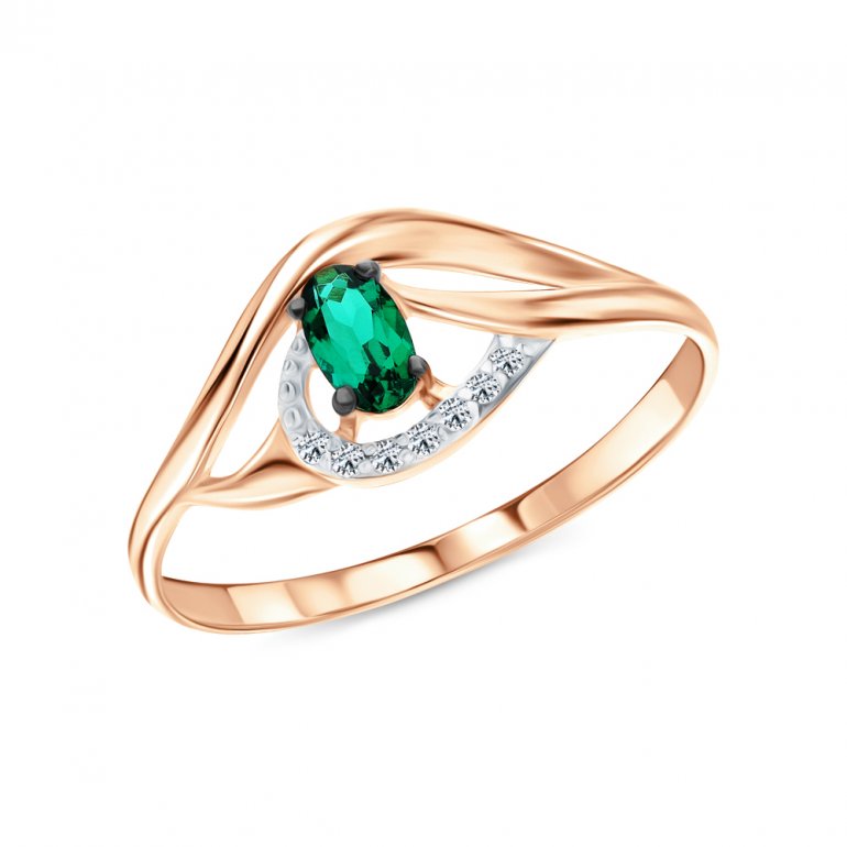 Кольцо с 7 бриллиантами природными, 0.029 карат, огранка круг 17 граней, цвет 2, чистота 2, тип огранки А; 1 гидротермальным изумрудом, 0.225 карат, тип огранки Б; Розовое золото 585 пробы.