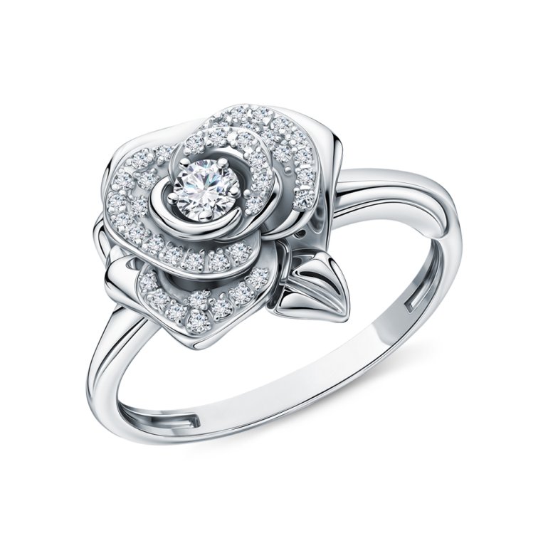 Кольцо с 1 бриллиантом природным, 0.121 карат, огранка круг 57 граней, цвет 4, чистота 6, тип огранки А; 39 бриллиантами природными, 0.139 карат, огранка круг 17 граней, цвет 2, чистота 2, тип огранки А; Белое золото 585 пробы.
