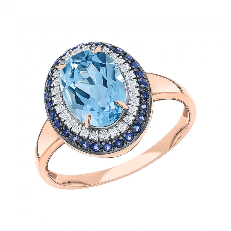 Кольцо с 28 бриллиантами природными, 0.104 карат, огранка круг 17 граней, цвет 2, чистота 2, тип огранки Б; 1 топазом скай природным, 2.433 карат, тип огранки Б; 28 сапфирами природными, 0.287 карат, цвет 2, чистота 2, тип огранки В; Розовое золото 585 пробы.