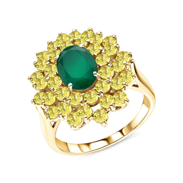 Кольцо с 36 сапфирами желтыми, 2.003 карат, тип огранки В; 1 агатом зеленым, тип огранки Б; Желтое золото 585 пробы.