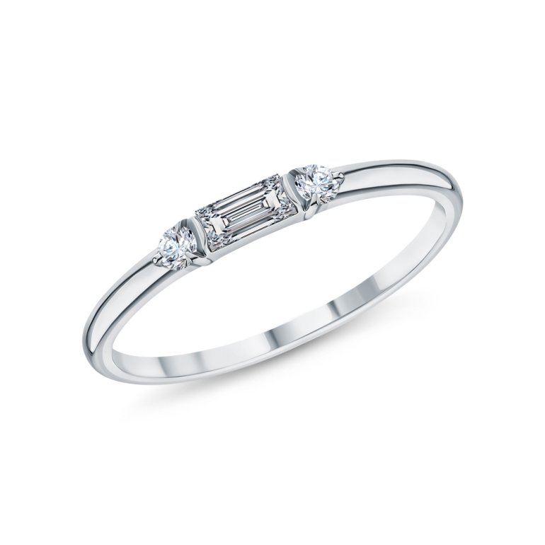 Кольцо с 1 бриллиантом выращенным, 0.117 карат, огранка багет 33 грани, цвет 3, чистота 6, тип огранки А; 2 бриллиантами выращенными, 0.067 карат, огранка круг 57 граней, цвет 3, чистота 6, тип огранки А; Белое золото 585 пробы.