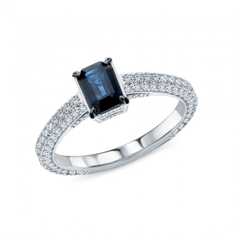 Кольцо с 34 бриллиантами природными, 0.375 карат, огранка круг 57 граней, цвет 3, чистота 6, тип огранки А; 68 бриллиантами природными, 0.493 карат, огранка круг 57 граней, цвет 3, чистота 6, тип огранки А; 10 бриллиантами природными, 0.035 карат, огранка круг 57 граней, цвет 3, чистота 6, тип огранки А; 22 бриллиантами природными, 0.042 карат, огранка круг 57 граней, цвет 3, чистота 6, тип огранки А; 1 сапфиром природным, 0.95 карат, цвет 2, чистота 2, тип огранки Б; Белое золото 585 пробы.