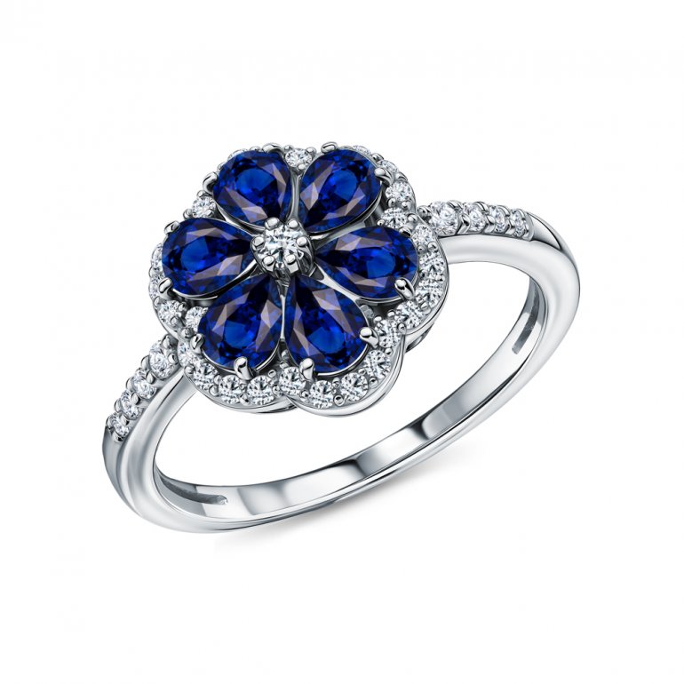 Кольцо с 3 бриллиантами природными, 0.047 карат, огранка круг 57 граней, цвет 3, чистота 6, тип огранки А; 4 бриллиантами природными, 0.038 карат, огранка круг 17 граней, цвет 2, чистота 3, тип огранки Б; 28 бриллиантами природными, 0.166 карат, огранка круг 17 граней, цвет 2, чистота 3, тип огранки Б; 2 бриллиантами природными, 0.01 карат, огранка круг 17 граней, цвет 2, чистота 3, тип огранки Б; 6 сапфирами природными, 1.083 карат, цвет 3, чистота 4, тип огранки Б; Белое золото 585 пробы.