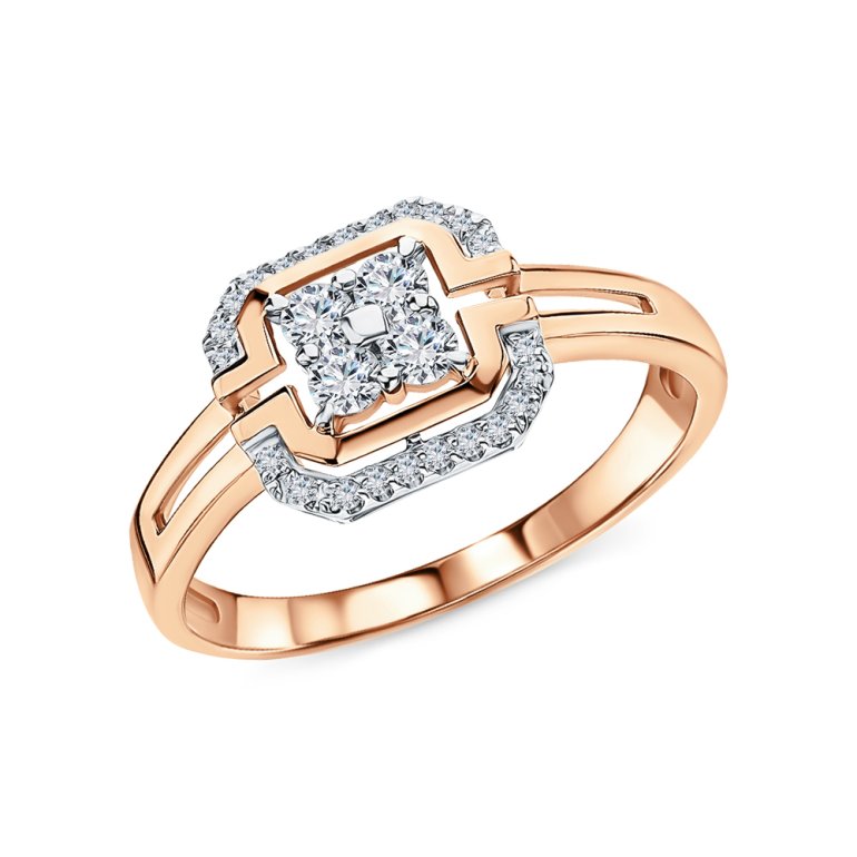 Кольцо с 4 бриллиантами природными, 0.288 карат, огранка круг 57 граней, цвет 4, чистота 5, тип огранки А; 24 бриллиантами природными, 0.102 карат, огранка круг 17 граней, цвет 2, чистота 2, тип огранки А; Розовое золото 585 пробы.