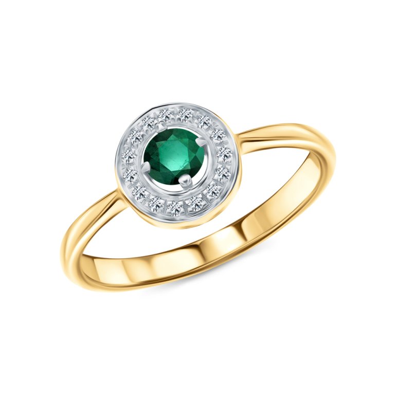 Кольцо с 15 бриллиантами природными, 0.038 карат, огранка круг 17 граней, цвет 2, чистота 2, тип огранки А; 1 изумрудом природным, 0.138 карат, цвет 3, чистота 3, тип огранки В; Желтое золото 585 пробы.