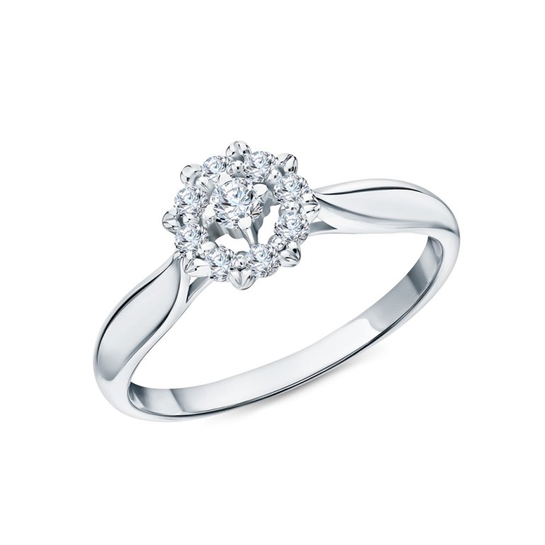 Кольцо с 1 бриллиантом природным, 0.064 карат, огранка круг 57 граней, цвет 3, чистота 6, тип огранки А; 8 бриллиантами природными, 0.153 карат, огранка круг 57 граней, цвет 3, чистота 6, тип огранки А; Белое золото 585 пробы.
