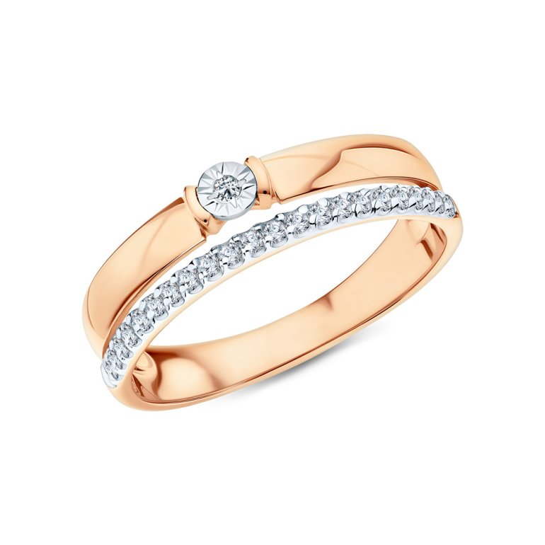 Кольцо с 1 бриллиантом природным, 0.008 карат, огранка круг 57 граней, цвет 3, чистота 6, тип огранки А; 21 бриллиантом природным, 0.074 карат, огранка круг 17 граней, цвет 2, чистота 2, тип огранки А; Розовое и белое золото 585 пробы.