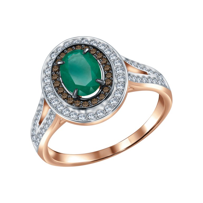 Кольцо с 60 бриллиантами природными, 0.21 карат, огранка круг 17 граней, цвет 2, чистота 2, тип огранки Б; 1 изумрудом природным, 0.663 карат, цвет 3, чистота 3, тип огранки Б; 22 бриллиантами коньячными природными, 0.065 карат, огранка круг 57 граней, цвет 7, чистота 6, тип огранки А; Розовое золото 585 пробы.