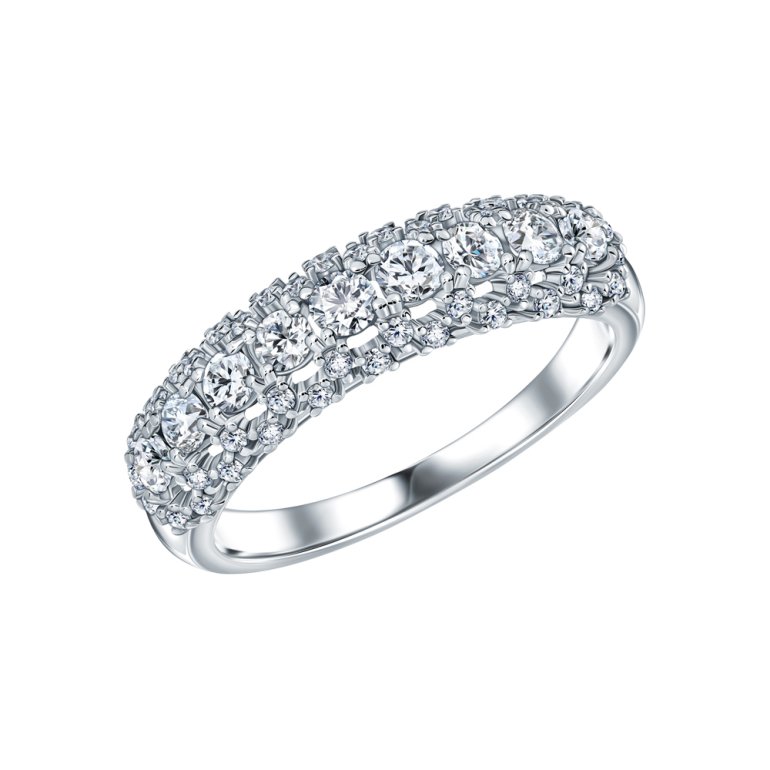 Кольцо с 9 бриллиантами природными, 0.495 карат, огранка круг 57 граней, цвет 3, чистота 6, тип огранки А; 42 бриллиантами природными, 0.235 карат, огранка круг 17 граней, цвет 2, чистота 2, тип огранки А; Белое золото 585 пробы.