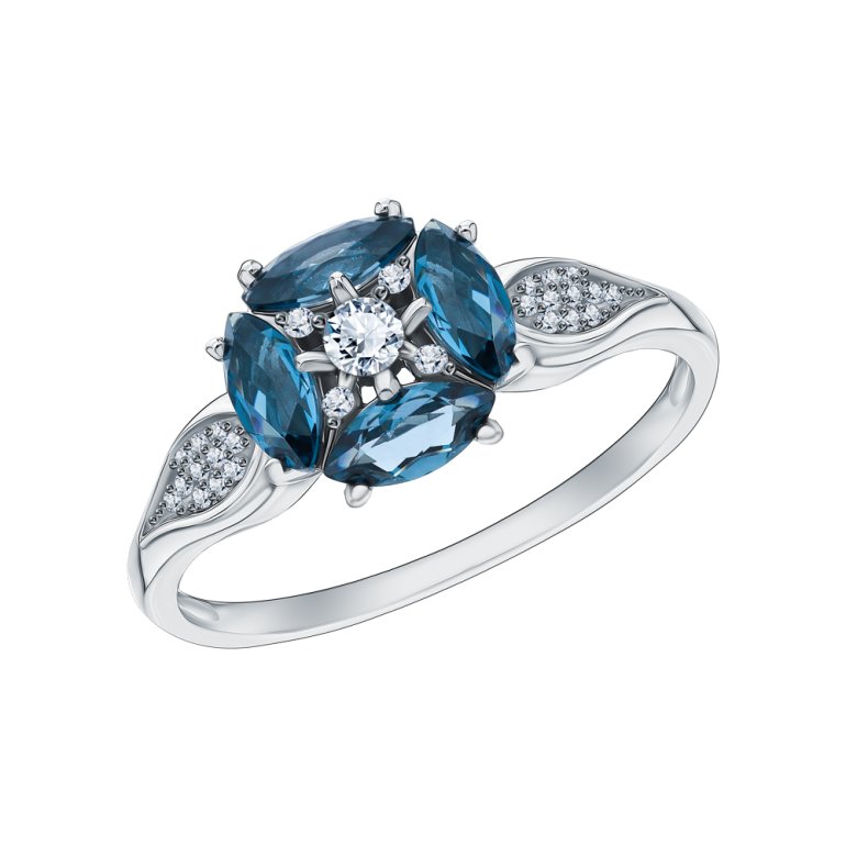 Кольцо с 4 топазами, 0.973 карат, тип огранки Б; 1 топазом бесцветным, 0.084 карат, тип огранки В; 4 бриллиантами, 0.017 карат, огранка круг 17 граней, цвет 2, чистота 2, тип огранки Б; 22 бриллиантами, 0.041 карат, огранка круг 17 граней, цвет 2, чистота 2, тип огранки Б; Белое золото 585 пробы.