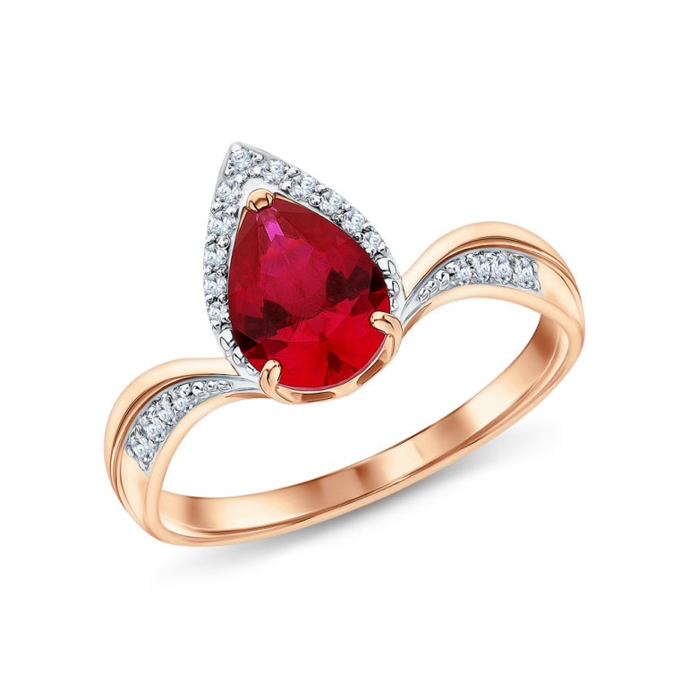 Кольцо с 9 бриллиантами природными, 0.079 карат, огранка круг 17 граней, цвет 2, чистота 2, тип огранки А; 10 бриллиантами природными, 0.041 карат, огранка круг 17 граней, цвет 2, чистота 2, тип огранки А; 1 рубином синтетическим, 1.32 карат, тип огранки Б; Розовое золото 585 пробы.