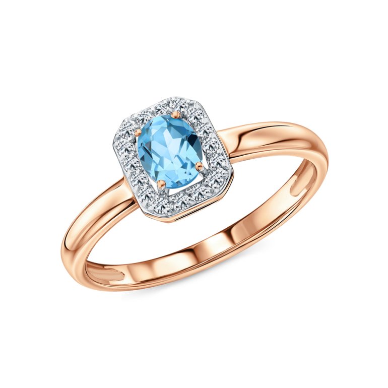 Кольцо с 16 бриллиантами природными, 0.081 карат, огранка круг 17 граней, цвет 2, чистота 2, тип огранки А; 1 топазом свисс природным, 0.375 карат, тип огранки Б; Розовое золото 585 пробы.