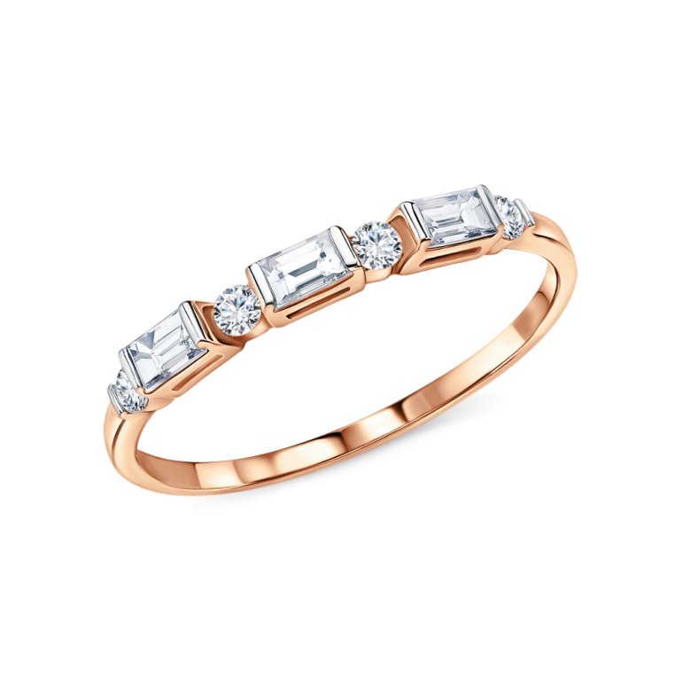 Кольцо с 3 бриллиантами природными, 0.24 карат, огранка багет 25 граней, цвет 3, чистота 3, тип огранки А; 4 бриллиантами природными, 0.105 карат, огранка круг 57 граней, цвет 3, чистота 6, тип огранки А; Розовое золото 585 пробы.