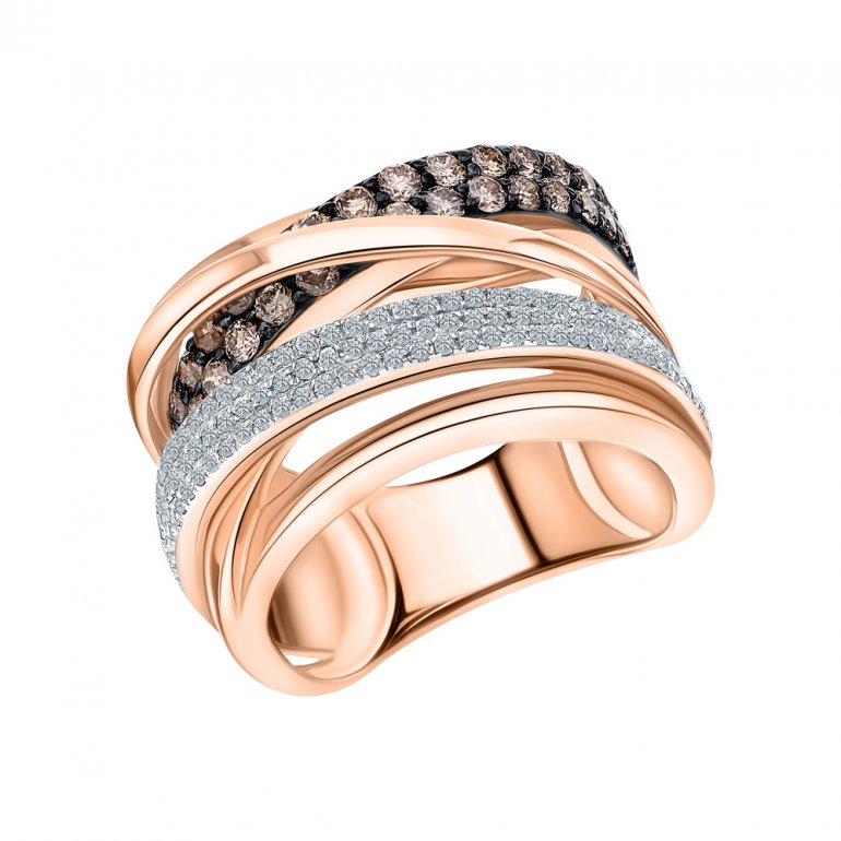 Кольцо с 119 бриллиантами природными, 0.212 карат, огранка круг 17 граней, цвет 2, чистота 2, тип огранки Б; 32 бриллиантами коньячными природными, 0.405 карат, огранка круг 57 граней, цвет 7, чистота 5, тип огранки А; Розовое золото 585 пробы.