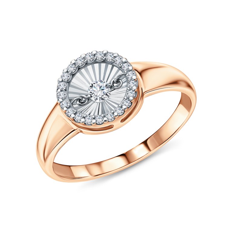 Кольцо с 1 бриллиантом природным, 0.053 карат, огранка круг 57 граней, цвет 3, чистота 6, тип огранки А; 21 бриллиантом природным, 0.089 карат, огранка круг 57 граней, цвет 3, чистота 6, тип огранки А; Розовое и белое золото 585 пробы.