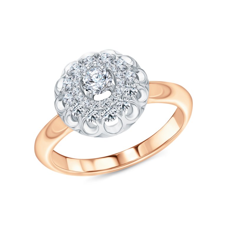Кольцо с 1 бриллиантом природным, 0.163 карат, огранка круг 57 граней, цвет 3, чистота 6, тип огранки А; 12 бриллиантами природными, 0.269 карат, огранка круг 57 граней, цвет 3, чистота 6, тип огранки А; 16 бриллиантами природными, 0.065 карат, огранка круг 57 граней, цвет 3, чистота 6, тип огранки А; Розовое и белое золото 585 пробы.