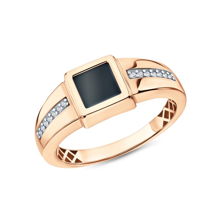 Кольцо с 1 ониксом черным, тип огранки Б; фианитом бесцветным; Розовое золото 585 пробы.