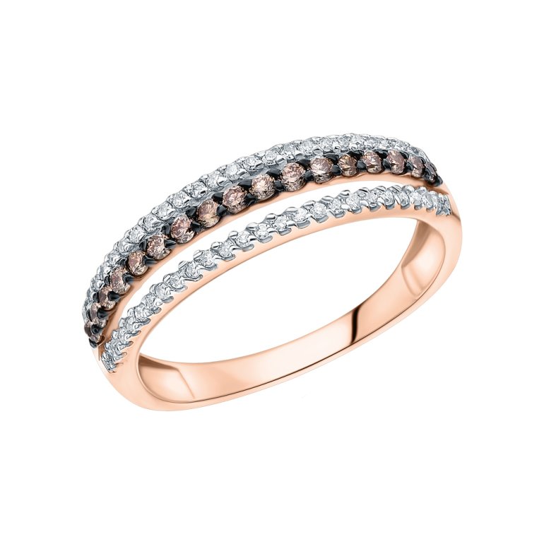 Кольцо с 48 бриллиантами природными, 0.101 карат, огранка круг 17 граней, цвет 2, чистота 2, тип огранки А; 17 бриллиантами коньячными природными, 0.104 карат, огранка круг 57 граней, цвет 7, чистота 5, тип огранки А; Розовое золото 585 пробы.