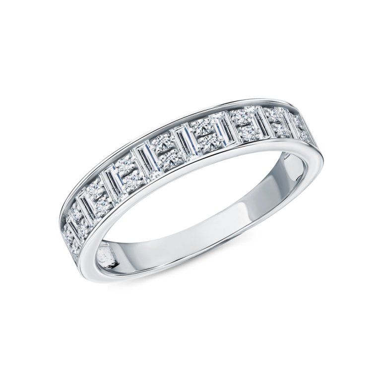 Кольцо с 8 бриллиантами выращенными, 0.391 карат, огранка багет 33 грани, цвет 3, чистота 6, тип огранки А; 18 бриллиантами выращенными, 0.135 карат, огранка круг 57 граней, цвет 3, чистота 6, тип огранки А; Белое золото 585 пробы.