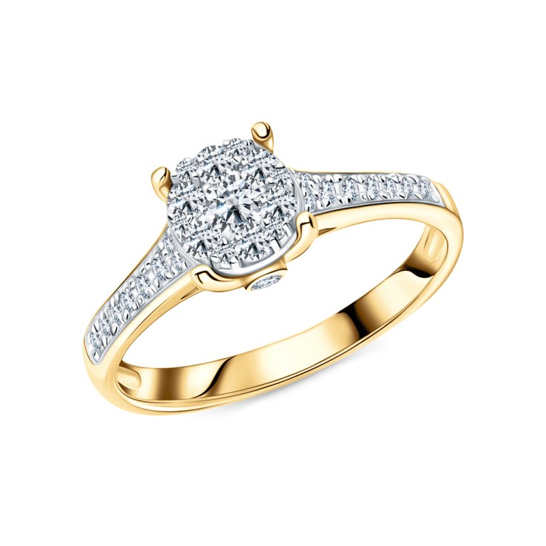 Кольцо с 1 бриллиантом природным, 0.072 карат, огранка круг 57 граней, цвет 3, чистота 6, тип огранки А; 6 бриллиантами природными, 0.12 карат, огранка круг 57 граней, цвет 3, чистота 6, тип огранки А; 6 бриллиантами природными, 0.042 карат, огранка круг 57 граней, цвет 3, чистота 6, тип огранки А; 18 бриллиантами природными, 0.056 карат, огранка круг 17 граней, цвет 2, чистота 2, тип огранки А; Желтое золото 585 пробы.