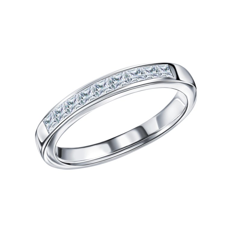 Кольцо с 9 бриллиантами, 0.494 карат, огранка принцесса 65 граней, цвет 3, чистота 6, тип огранки А; Белое золото 585 пробы.