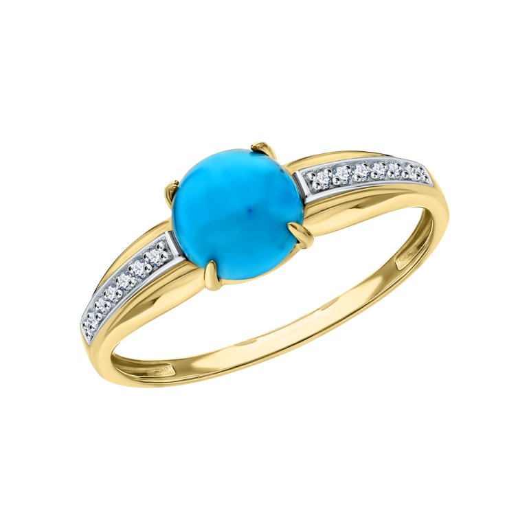 Кольцо с 14 бриллиантами природными, 0.056 карат, огранка круг 17 граней, цвет 2, чистота 2, тип огранки А; 1 бирюзой стабилизорованной, тип огранки Б; Желтое золото 585 пробы.