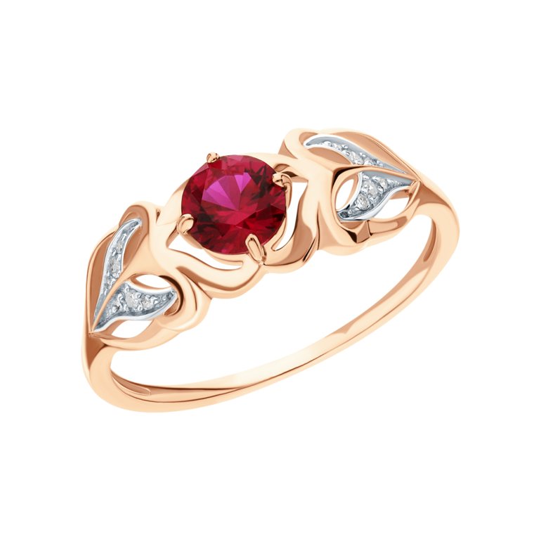 Кольцо с 4 бриллиантами природными, 0.015 карат, огранка круг 17 граней, цвет 2, чистота 2, тип огранки Б; 8 бриллиантами природными, 0.015 карат, огранка круг 17 граней, цвет 2, чистота 2, тип огранки Б; 1 рубином синтетическим, 0.605 карат, тип огранки В; Розовое золото 585 пробы.