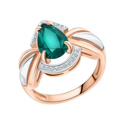 Кольцо с 1 гидротермальным изумрудом, 1.125 карат, тип огранки Б; 18 бриллиантами, 0.038 карат, огранка круг 17 граней, цвет 2, чистота 2, тип огранки А; Розовое золото 585 пробы.