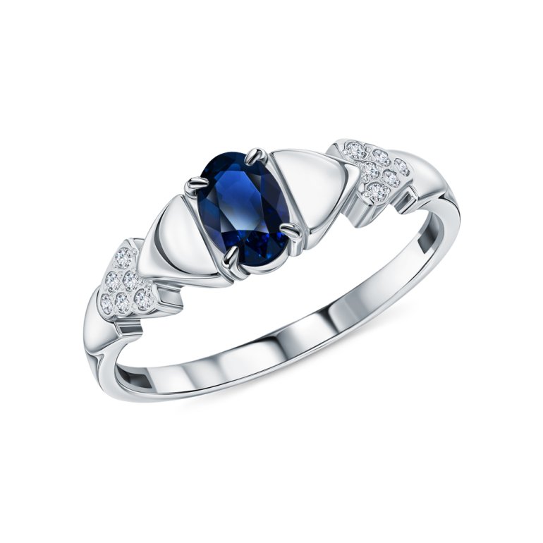 Кольцо с 12 бриллиантами природными, 0.048 карат, огранка круг 17 граней, цвет 2, чистота 2, тип огранки А; 1 сапфиром природным, 0.529 карат, цвет 2, чистота 2, тип огранки Б; Белое золото 585 пробы.