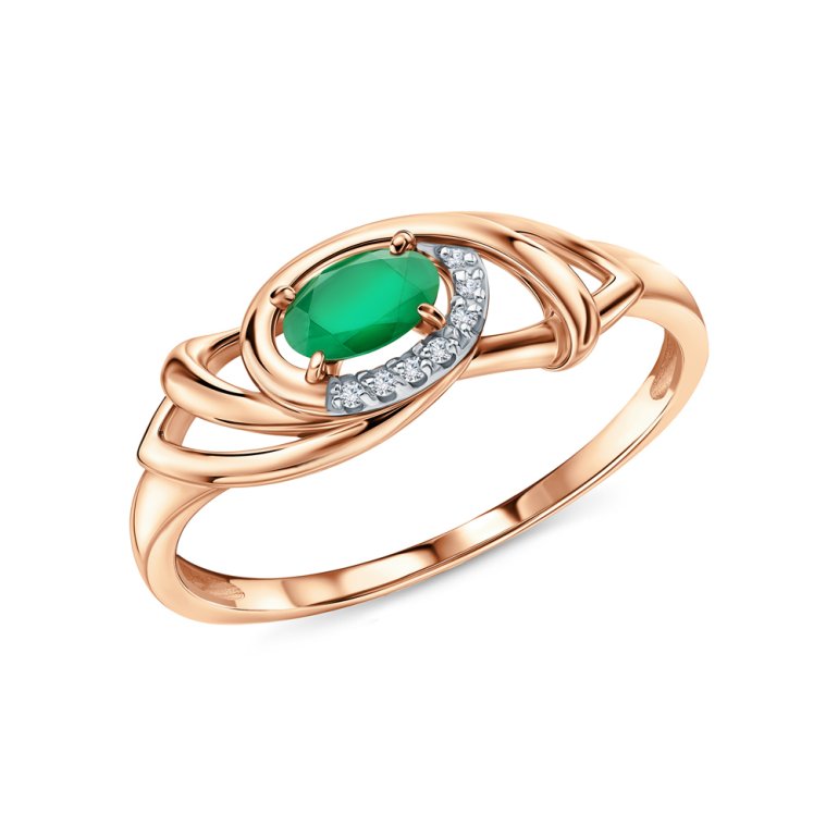 Кольцо с 1 изумрудом природным, 0.198 карат, цвет 4, чистота 3, тип огранки Б; 7 бриллиантами, 0.015 карат, огранка круг 17 граней, цвет 2, чистота 2, тип огранки А; Розовое золото 585 пробы.