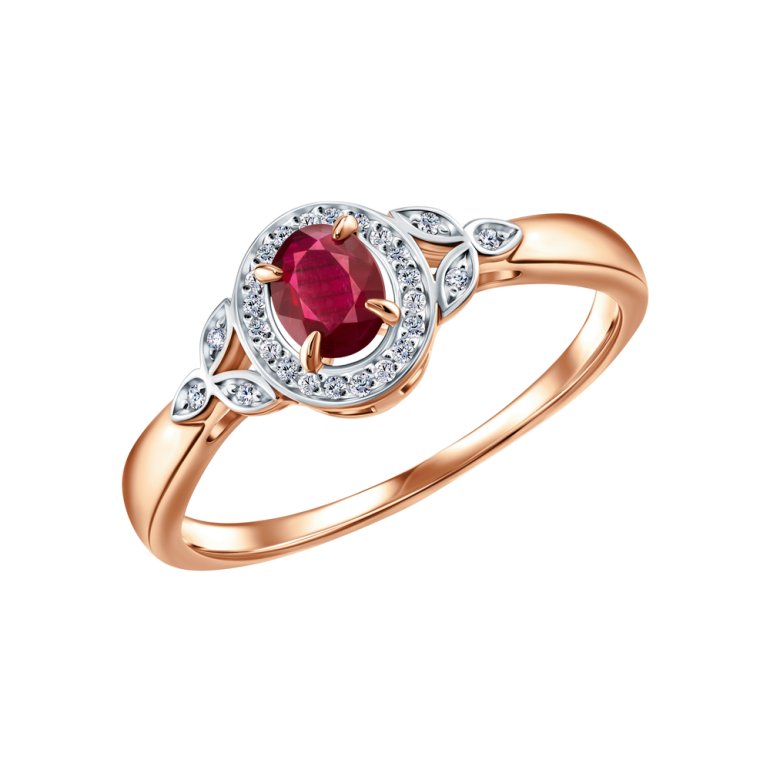 Кольцо с 26 бриллиантами природными, 0.055 карат, огранка круг 17 граней, цвет 2, чистота 2, тип огранки Б; 1 рубином природным, 0.376 карат, цвет 2, чистота 2, тип огранки Б; Розовое золото 585 пробы.